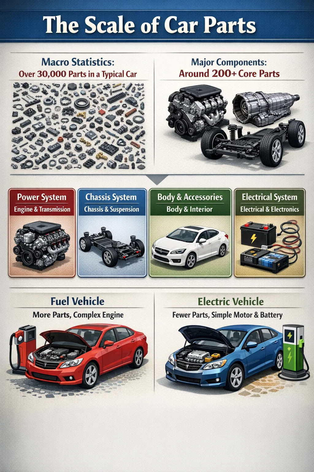 Hvis vi ændrer vores perspektiv og betragter komplekse mekaniske enheder som motoren, transmissionen og chassiset som enkelte enheder, så består en bil af cirka flere hundrede hovedkomponenter. Denne klassificering er tættere på, hvad vi normalt hører på værksteder.