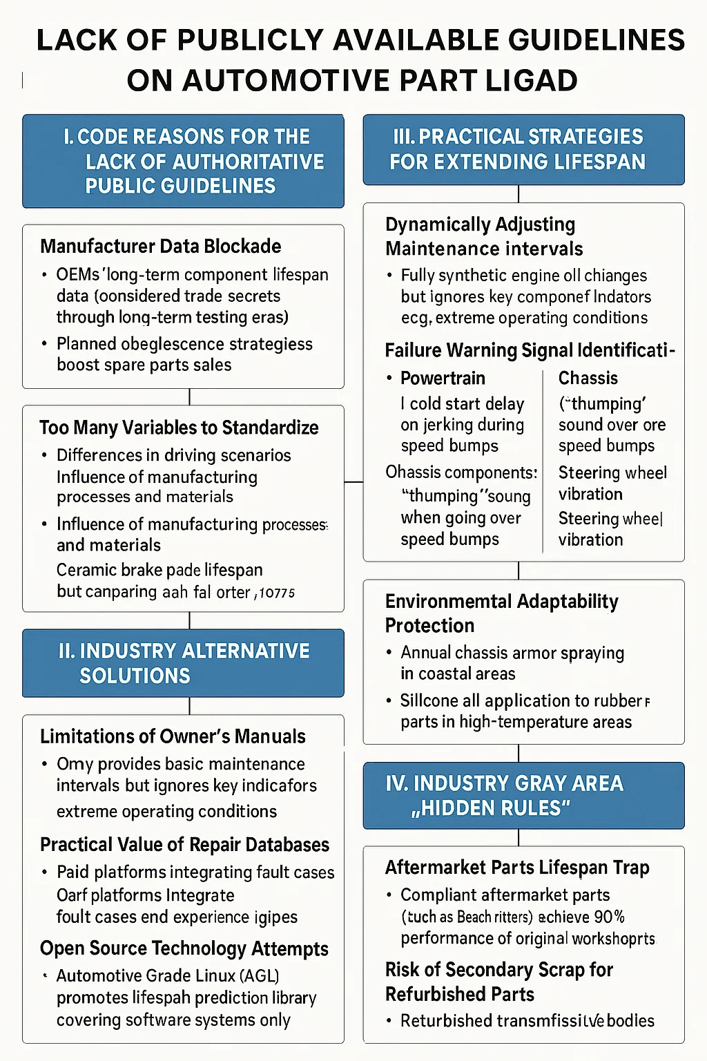 I bilreparationsindustrien er der ingen enkelt offentligt tilgængelig retningslinje, der dækker hele levetiden for alle bildele . Denne situation stammer fra industriens kompleksitet og indflydelsen af flere variabler. Det følgende er en nøgleanalyse af disse faktorer: