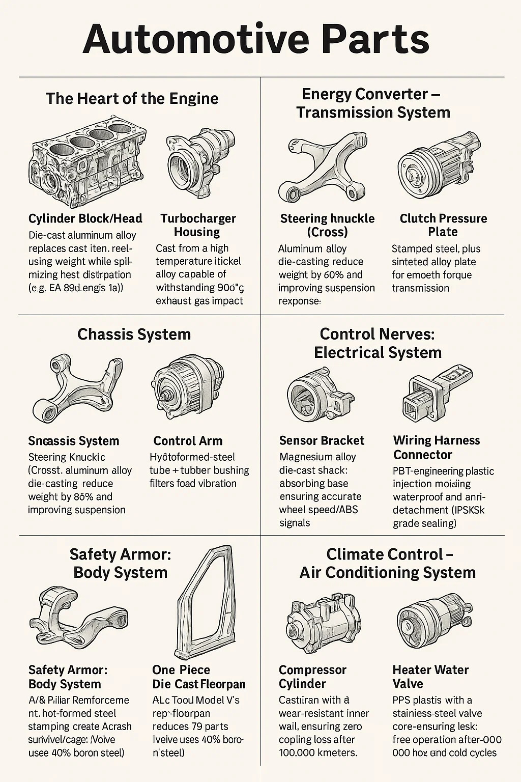 Styringsknok (kryds): Aluminiumslegering Die-casting reducerer vægten med 30% og forbedrer suspensionsresponsen (Teslas die-støbte frontophæng i ét stykke).