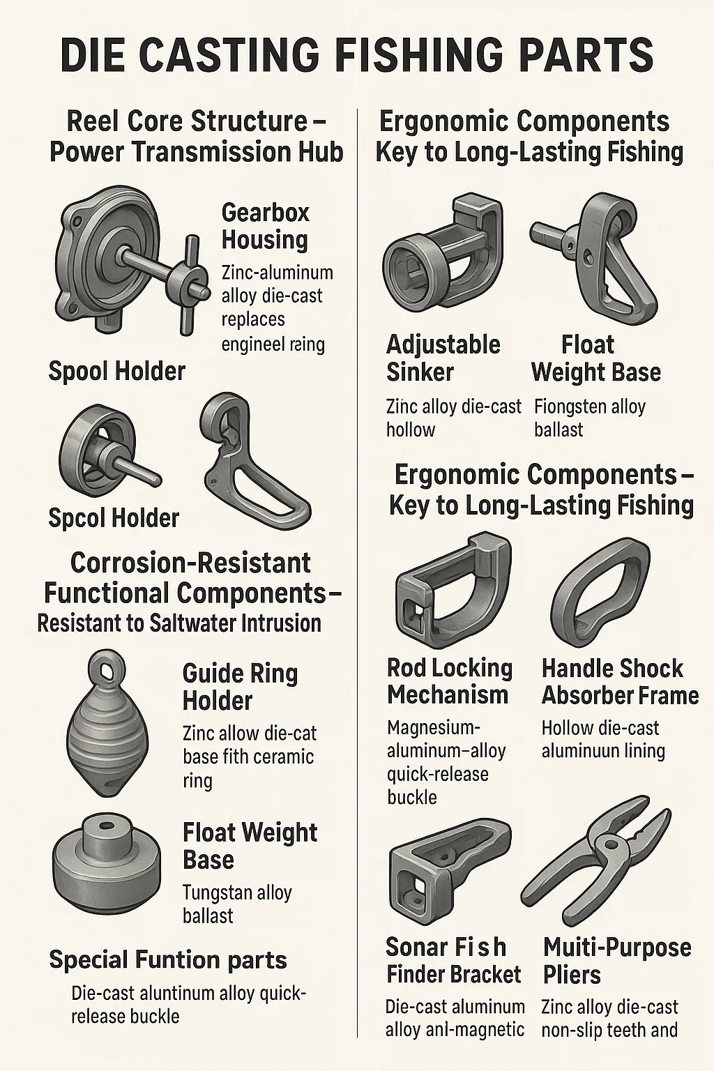 Die casting fiskedele er kernetalkomponenter fremstillet ved hjælp af en støbningsproces med høj tryk. De imødekommer de vigtigste fiskeribagningskrav, såsom letvægt, korrosionsbestandighed og funktionel pålidelighed. De vigtigste applikationer og funktioner er som følger: