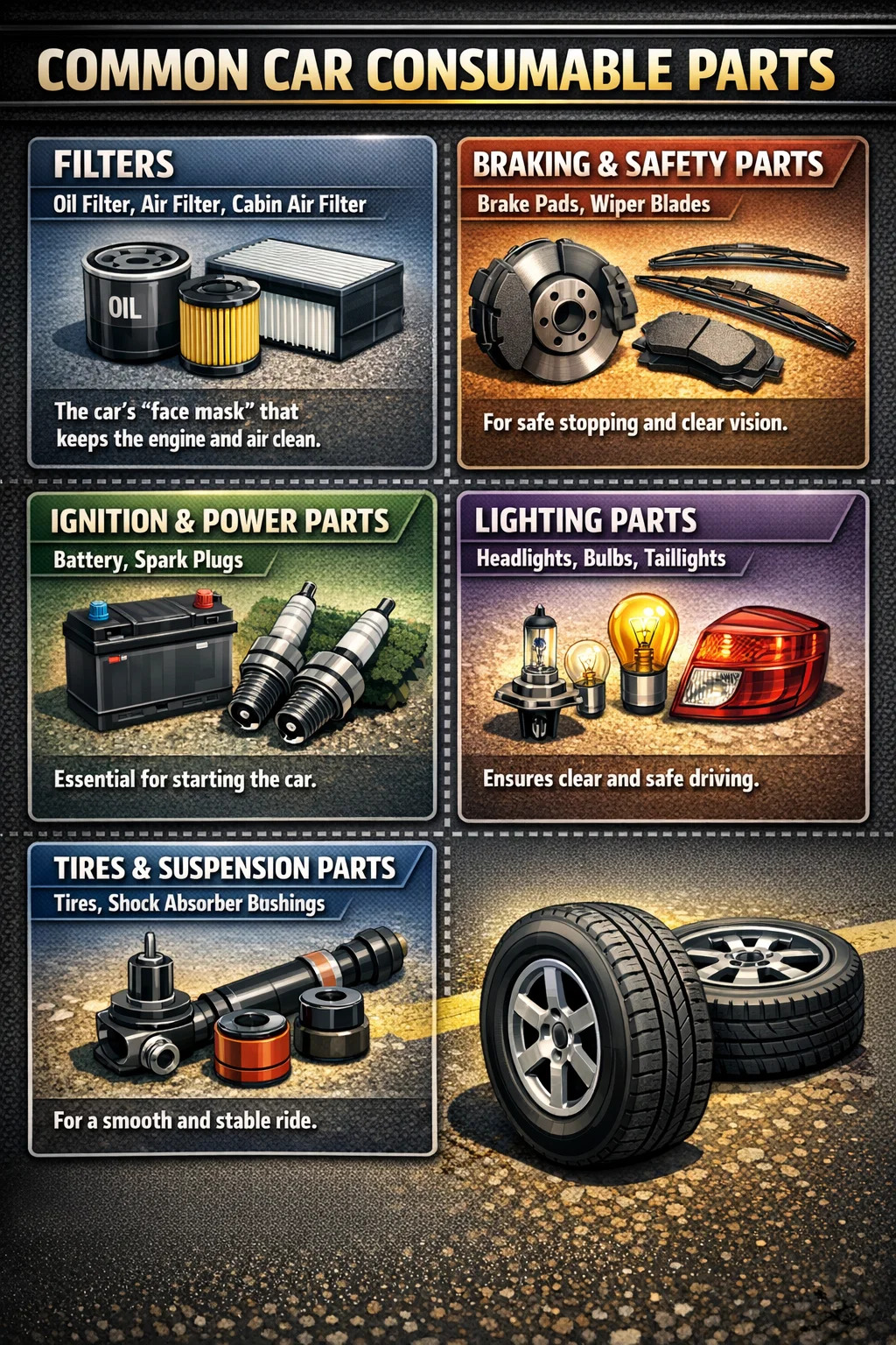 Enkel forklaring: For at sikre sikker standsning er bremseklodser en af de hurtigst slidte bildele. Uanset mærket på din bil, har vejværksteder normalt bremseklodser, der matcher din model. Viskerblade falder også ind under denne kategori; på grund af ældningen af gummiet er det almindelige dele, som nemt kan købes i supermarkeder og tankstationer.
